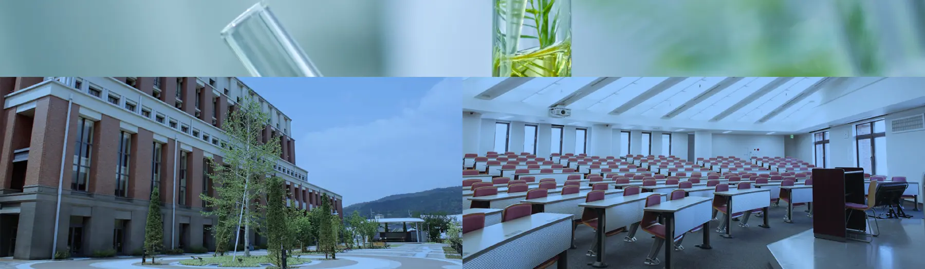 1学年すべての学生を収容する大講義室や、充実した実験器具を揃え、講義や実習に専念できる環境を整えています。さらには、先端的な各種分析装置を共同利用できる施設や、国内薬系大学ではトップクラスの規模を誇る薬用植物園などを有し、研究の推進をしています。その他、緑化された中央庭園やテラスなど、リフレッシュできるスペースも備えています
