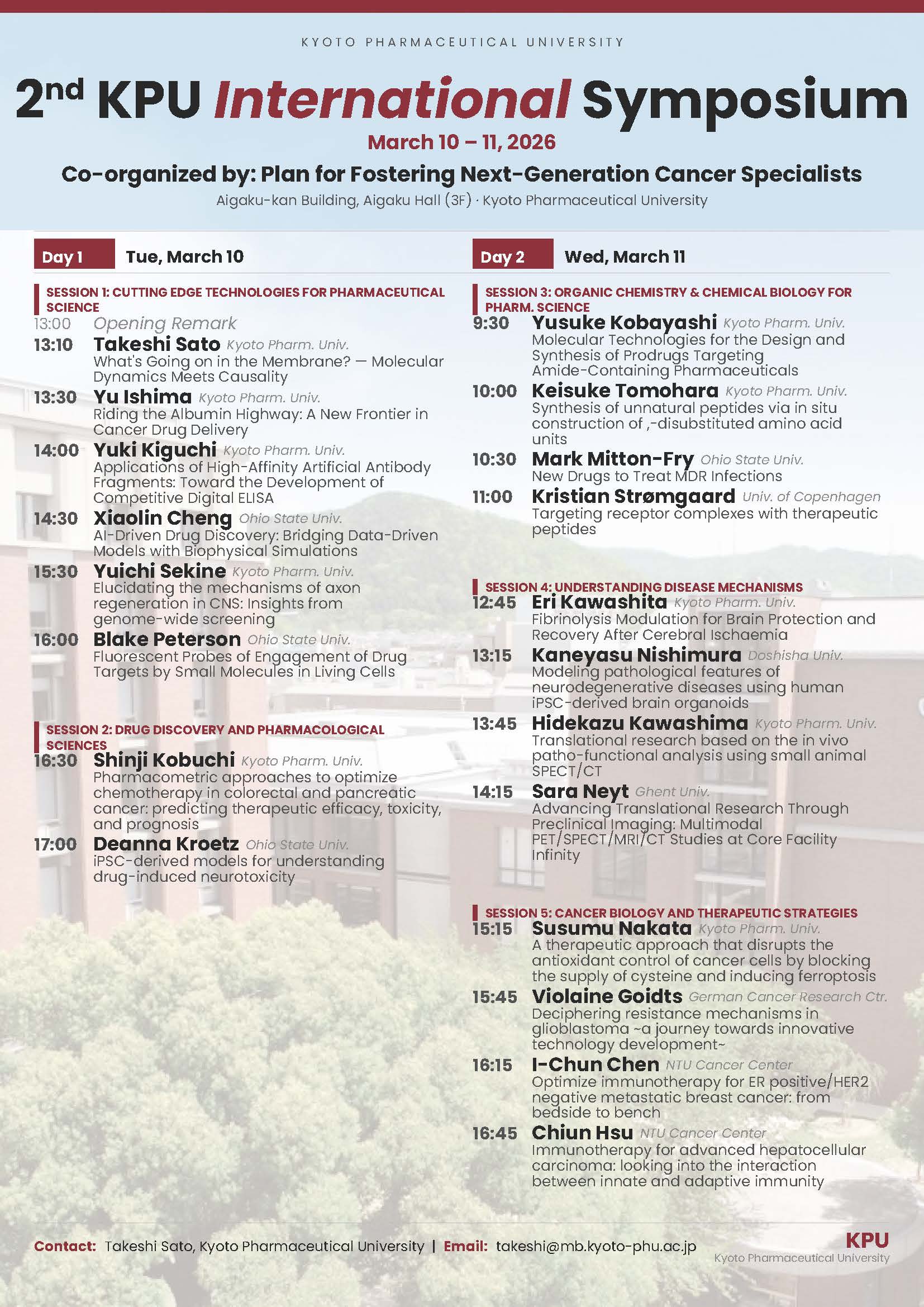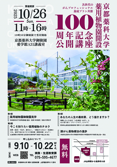 医療の進歩に伴いさまざまな治療方法が確立されていますが、がんは依然として我が国の死因第一位の疾患です。第4期がん対策推進基本計画において定められた全体目標「誰一人取り残さないがん対策を推進し、全ての国民とがんの克服を目指す」に向けて、がん医療に関する基本的な知識や技能を有し、がん医療を支える医療従事者の養成が求められています。京都薬科大学では、文部科学省が実施する「次世代のがんプロフェッショナル養成プラン」に参画し、がん医療の新たなニーズや急速ながん医療の高度化に対応できる医療人の育成を目指した取り組みを行っています。本学では、京都大学・滋賀医科大学・三重大学・大阪医科薬科大学を含む5大学間の連携により実施する事業「高度化・多様化するがん医療を担う人材育成」を通して、