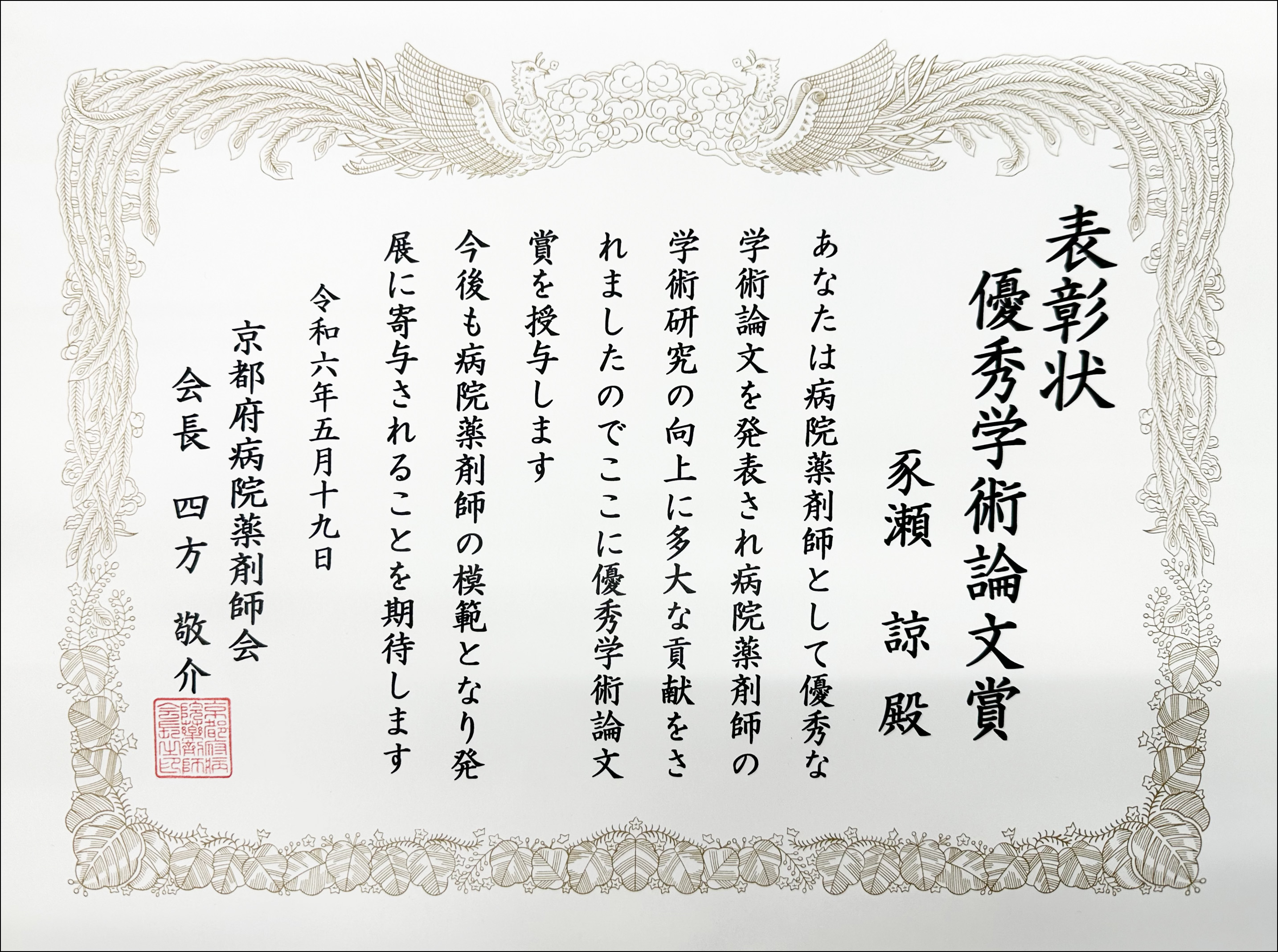 2024年5月19日(日)に開催された京都府薬剤師会病院診療所薬剤師部会において、臨床薬剤疫学分野の豕瀬 諒助教と青戸和宏さんが優秀学術論文賞を受賞しました。