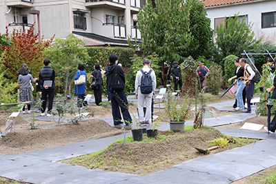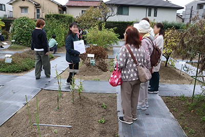 薬用植物園「御陵園」の見学は、5年ぶりとなる開催で、約130 名の方にお越しいただきました。見学に訪れた方々は教員と学生スタッフの植物の解説を聞きながら、秋の薬用植物を観察し、植物の写真を撮ったり、学生スタッフに質問するなど、普段はあまり見ることのない薬用植物に対して興味をもつ様子がうかがえました。