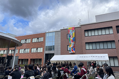 1日目は、中央庭園ステージでのファッションショーから始まり、模擬店の商品の試食会などを実施しました。さらに今年度は、厚生労働省、京都府主催の「令和7年度麻薬・覚醒剤・大麻乱用防止運動 京都大会」も実施され、薬物乱用防止について理解を促進するよい機会となりました。また、躬行館では室内企画や展示を、130周年記念館ではダンスステージと昨年に引き続きアーティストライブを実施しました。今年度のアーティストには「ヤングスキニー」を迎え、大勢の観客を魅了しました。