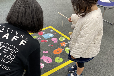 2日目は数年ぶりの開催となる「芸人ライブ」を開催しました。メディアで活躍する芸人3組が登場し、会場を大いに盛り上げていただきました。躬行館では演奏や室内企画もあり、「こどもランド」ではお魚釣りゲームやクイズなど、多くのお子さんが楽しんでいる様子が見られました。