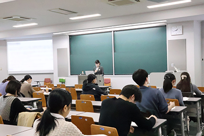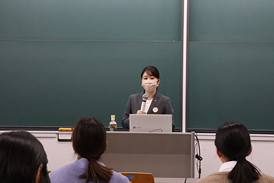 講師には独立行政法人医薬品医療機器総合機構(PMDA)で勤務されており、また本学卒業生でもある小川様をお招きしました。PMDAの概要や、小川様がこれまで経験してきた3つの部門の具体的な業務内容を説明いただきました。医薬品だけでなく医療機器に関する仕事も従事したこと、医薬品が安心して使用できるよう安全対策の仕事をしていたこと、希望していた英語を活用して海外の方と仕事をしていることなどについて生き生きとお話しをされ、仕事の楽しさ・やりがいを伝えていただきました。
