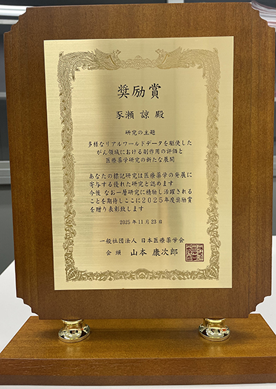 2025年11月23日(日)に開催された日本医療薬学会において、臨床薬剤疫学分野の豕瀬 諒助教が奨励賞を受賞しました。