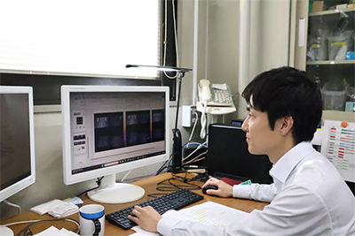 河渕 真治助教。現在の研究内容や教育・研究活動の様子、また本学へ入学した理由や学生時代のお話も伺いました。