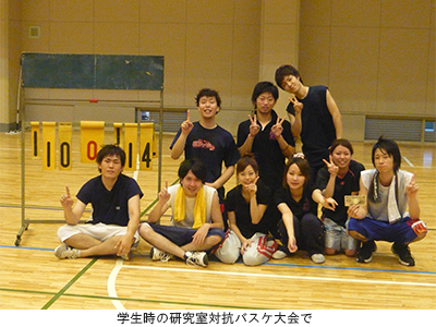 学部生のときはバスケットボール部に所属していて、学業もクラブ活動も楽しかったですね。また研究室配属後にコミュニティがすごく広がったと感じました。同期だけでなく先輩・後輩、卒業生とのつながりがどんどん広がり、それが自分の視野を広げることにもつながりました。