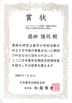 共同利用機器センターの扇田隆司助教が2025年度 日本薬学会関西支部奨励賞を受賞しました。