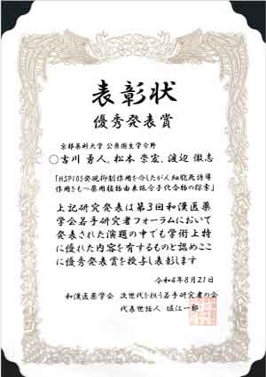 2022年8月21日(日)にオンラインで開催された第3回和漢医薬学会若手研究者フォーラムにおいて、公衆衛生学分野の吉川勇人さんが優秀発表賞を受賞しました。