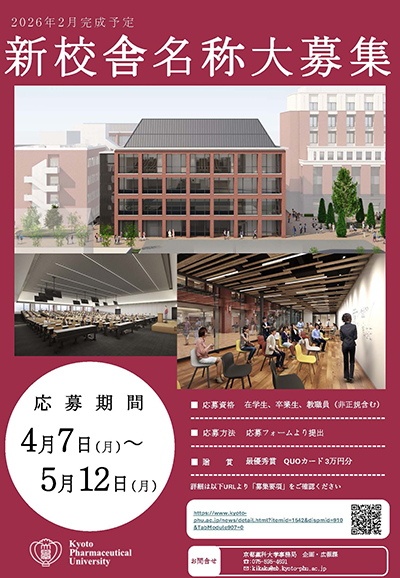 京都薬科大学(京都市山科区)は、2026年2月に完成予定の新校舎について2025年4月7日(月)から5月12日(月)まで、名称の公募を行います。